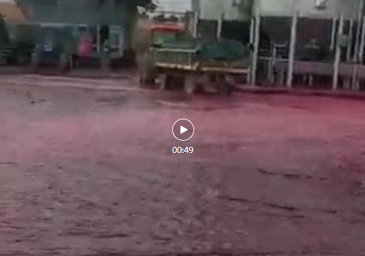 视频显示了爆炸发生后不久,葡萄酒喷涌而出,摄影师被迫后退,喷涌出的红色液体冲得到处都是,周围的鹅卵石被浸泡在一滴美味的西班牙葡萄酒中,葡萄酒从拖拉机和汽车周围流出,流入附近的田野和下水道。