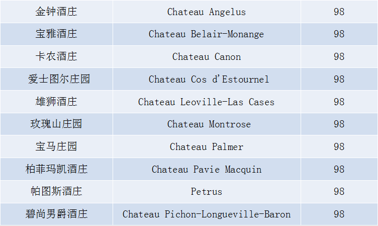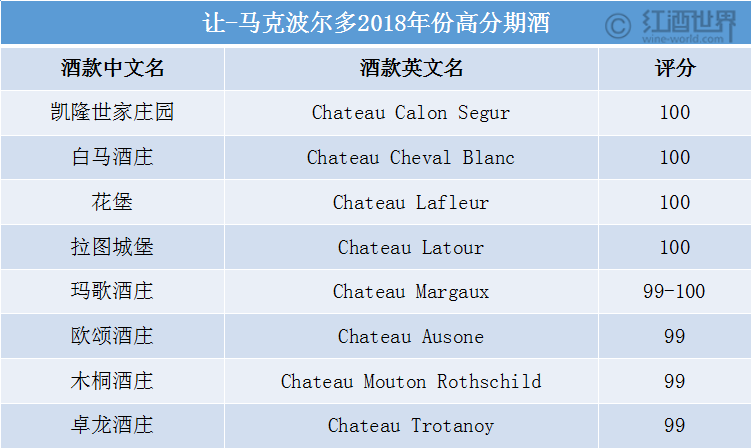 这份榜单上一共有18款期酒入围,其中有4款期酒获得了让-马克100分的满分评价,它们分别来自